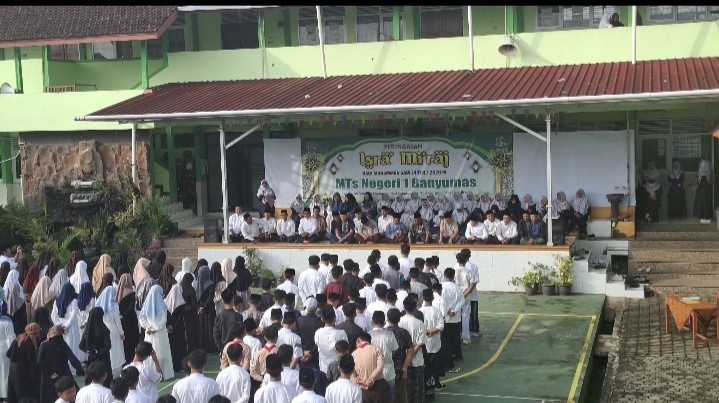 Purwokerto - Peringatan Isro Mi'roj Nabi Muhammad saw merupakan kegiatan rutin yang diselenggarakan oleh MTs N 1 Banyumas, momentum besar ini merupakan peristiwa yang bisa menjadikan penguat keimanan dan ketakwaan kepada Allah swt yang telah memperjalankan Nabi pilihan dari Masjidil Harom ke Masjidil Aqso dan dilanjutkan ke Sidrotul Muntaha pada malam 27 Rajab.