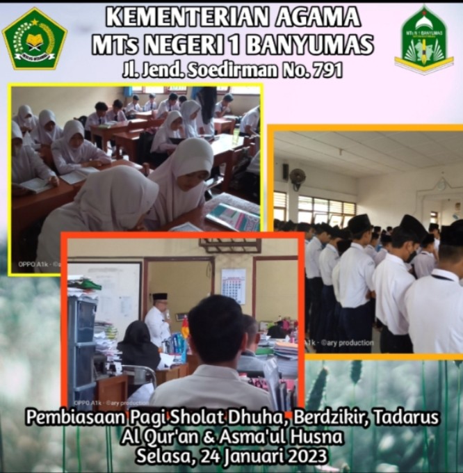 Pagi hari adalah waktu untuk memulai segala aktifitas, baik bekerja maupun belajar, aktifitas yang baik pada pagi hari akan berpengaruh besar bagi para siswa untuk meraih sukses dalam belajar, untuk itu MTs Negeri 1 Banyumas memulai kegiatan dengan pembiasaan pagi berupa doa bersama untuk para guru dan karyawan, sholat dluha serta tadarus Al Qur'an dan pembacaan Asma'ul Husna seperti yang dilaksanakan pada hari ini, Selasa 24 Januri 2023 pada pukul 07.00 s/d 07.30 WIB bertempat di Masjid Manbaul Ulum untuk sholat dluha, sementara tadarus Al Qur'an dan perwalian dilaksanakan di kelas masing-masing.