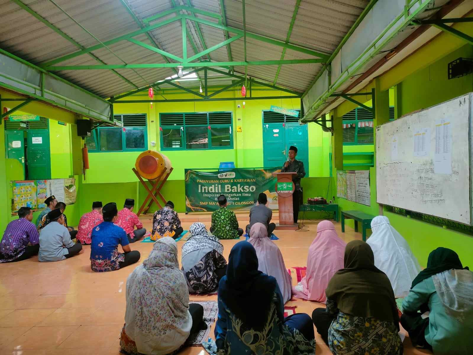 Banyumas - Pelaksanaan salat Dzuhur berjamaah di SMP Ma’arif NU 1 Cilongok berlangsung dalam suasana hangat dan berbeda dari biasanya. Para guru terlihat antusias menyambut kehadiran tamu istimewa, Dudiyono, Ketua Pergunu Kabupaten Banyumas, yang datang secara khusus untuk bersilaturahmi. Kehadiran beliau turut memeriahkan agenda rutin Indil Bakso (Inspirasi Dengarkan Ilmu Bakda Salat), sebuah kegiatan yang setiap hari diikuti bapak dan ibu guru setelah menunaikan ibadah berjamaah. Rabu (03/12)