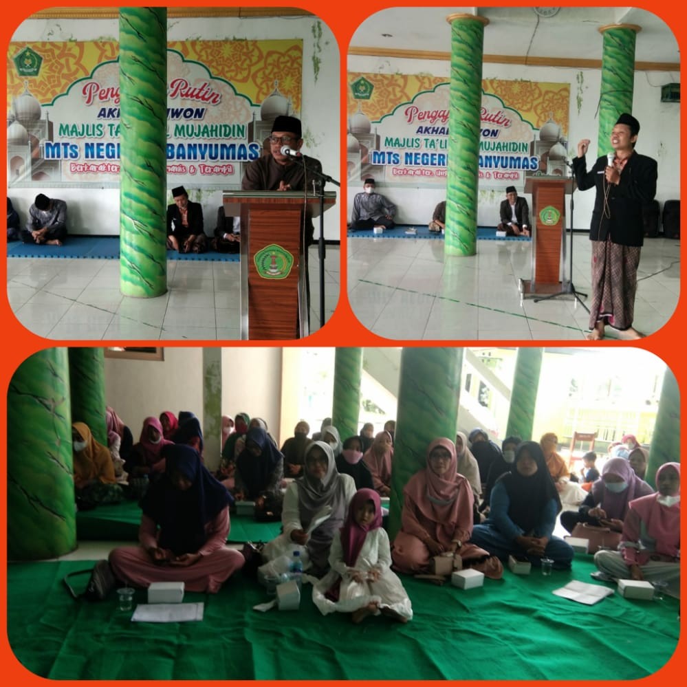 Banyumas_ Pengajian Ahad Kliwon oleh Majlis Ta’lim Al Mujahidin MTs Negeri 3 Banyumas (20/11/2022) dilaksanakan dengan pembicara Kyai. Amin Khaerudin, M.Ag. Pengasuh Pondok Pesantren Saains Al Qur’an Nusantara Tambak Sogra dimulai pukul 08.40 WIB sampai dengan pukul 10.30 WIB. Pengajian yang diikuti oleh orang tua atau wali murid siswa, Dewan Guru dan Karyawan, Komite dan para pengurus OSIM MTs Negeri 3 Banyumas berjalan dengan tertib dan sangat antusias. Sebelum pengajian dimulai dilaksanakan Istighotsah terlebih dahulu yang dipimpin oleh Kyai Ibni Ali Arifin.