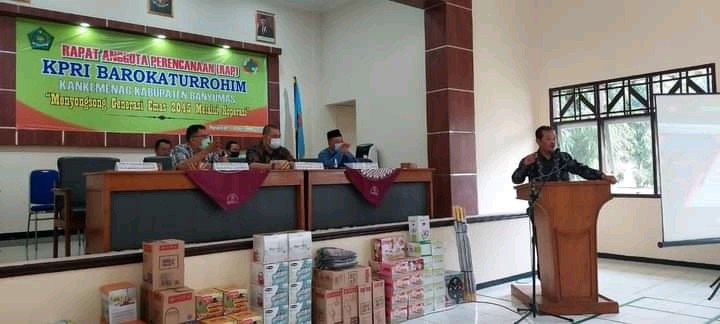 Purwokerto : Kepala kantor Kemenag Banyumas Drs. H. Akhsin Aedi, M.Ag /didampingi oleh ketua KPRI Barokaturrohim Ibnu Asaddudin, S.Ag, M.Pd, Kepala Dinas Tenaga Kerja, Koperasi dan UMKM kab. Banyumas Drs, Joko Wiyono, M.Si yang diwakili oleh kabid Koperasi Suntoro, SH, Ketua Dewan Koperasi Indonesia (Dekopinda) Kabupaten Banyumas, Muhammad Arsad Dalimunte, Ketua PKPI kabupaten Banyumas menghadiri acara Rapat Anggota Perencanaan (RAP) bertempat di aula Al Ikhlas kantor Kemenag Banyumas, Minggu,(14/11)