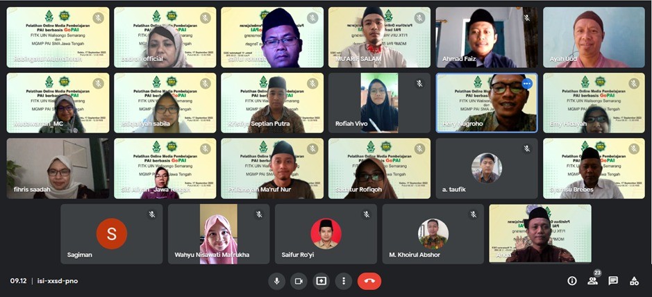 Semarang: Musyawarah Guru Mata Pelajaran Pendidikan Agama Islam (MGMP PAI) SMA Propinsi Jawa Tengah menggelar Pelatihan Media Berbasis Go-PAI secara online. Kegiatan yang dilaksanakan 17-24 September 2022 ini dihadiri oleh Kabid PAI Kanwil Kemenag Jawa Tengah, Dekan FITK UIN Walisongo Semarang, Kaprodi PAI FITK UIN Walisongo Semarang, Ketua MGMP PAI SMA Propinsi Jawa Tengah serta para peserta yang diikuti oleh 20 (dua puluh) peserta terpilih yang mewakili Guru PAI se Jawa Tengah. Sabtu (17/09)