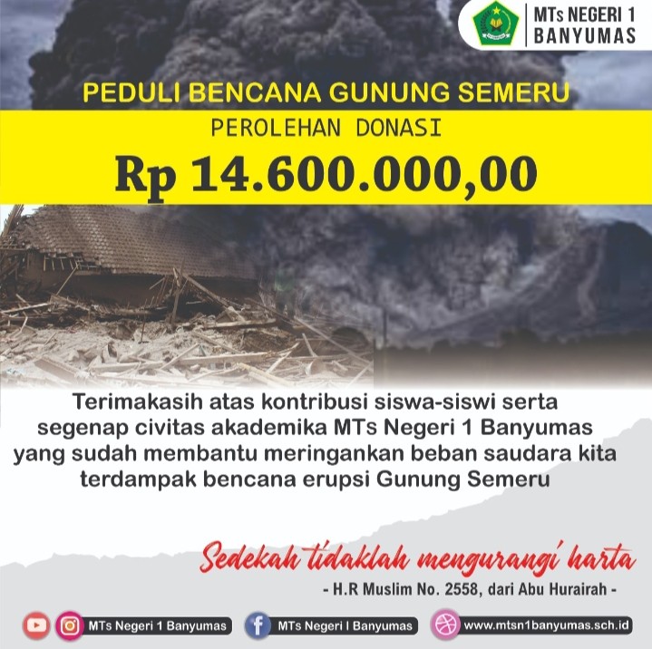 Kepedulian MTs Negeri 1 Banyumas terhadap bencana alam yang menimpa di daerah Lumajang dan sekitarnya berupa meletusnya Gunung Semeru diwujudkan dalam bentuk penggalangan dana bagi seluruh keluarga besar MTs Negeri 1 Banyumas meliputi seluruh guru, karyawan dan siswa kelas 7, 8 dan 9 pada hari Selasa (7/12/2021).