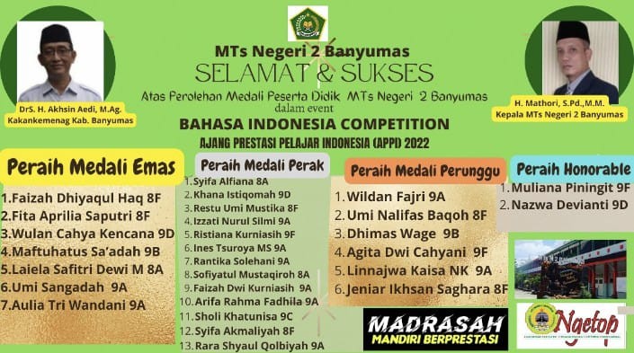 Banyumas- Siswa MTs N 2 Banyumas Sabet 7 medali emas, 13 medali perak, 6 medali perunggu dan 2 medali honorable pada Ajang Prestasi Pelajar Indonesia untuk event Bahasa Indonesia Competiton yang diadakan hari Minggu, 9 Januari 2022.