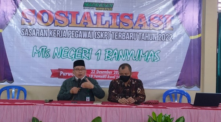Adanya perubahan aturan pemerintah mengenai Sasaran Kerja Pegawai di tahun 2022 menjadi landasan MTs Negeri 1 Banyumas mengadakan kegiatan sosialisasi SKP terbaru tahun 2022 bekerjasama dengan Kantor Kementerian Agama Kabupaten Banyumas dan diikuti oleh seluruh ASN MTs Negeri 1 Banyumas, bertempat di Aula pada hari Rabu, (22/12/2021).