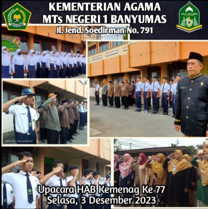 Dalam rangka memperingati Hari Amal Bhakti (HAB) Kementerian Agama Republik Indonesia Ke-77 MTs Negeri 1 Banyumas menggelar upacara bendera yang bertempat di halaman MTs Negeri 1 Banyumas pada hari Selasa, 3 Januari 2023 diikuti oleh seluruh guru dan karyawan serta perwakilan dari siswa kelas 7, 8 dan 9 yang tergabung dalam organisasi OSIS, Pramuka dan PMR.