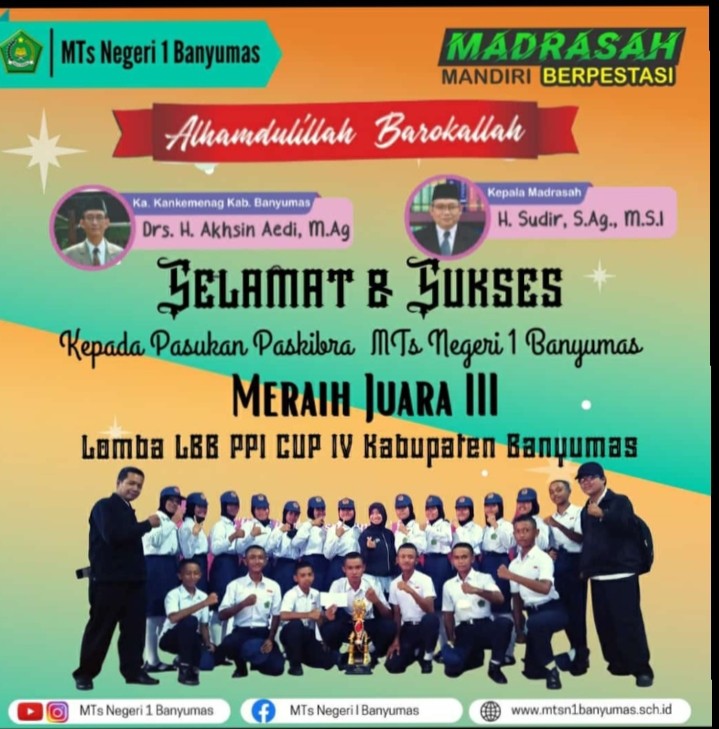Masa pandemi tak menyurutkan semangat para siswa MTs Negeri 1 Banyumas untuk meraih prestasi. Terbukti kali ini Paskibra MTs N 1 Banyumas mampu menyumbangkan Piala juara 3 Lomba LBB CUP IV Kabupaten Banyumas yang diikuti oleh seluruh pelajar tingkat SMP/MTs dan SMA/SMK/MA se Kqbupaten Banyumas pada hari Senin (13/12/2021).