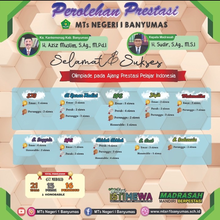 Siswa -Siswi MTs Negeri 1 Banyumas kembali menorehkan prestasi pada ajang Olimpiade Sains Madrasah (OSM) yang diselenggarakan secara online oleh APPI pada hari Ahad, 29 Mei 2022 untuk kategori mapel umum dan PAI jenjang MI/SD, MTs/SMP, MA/SMA.