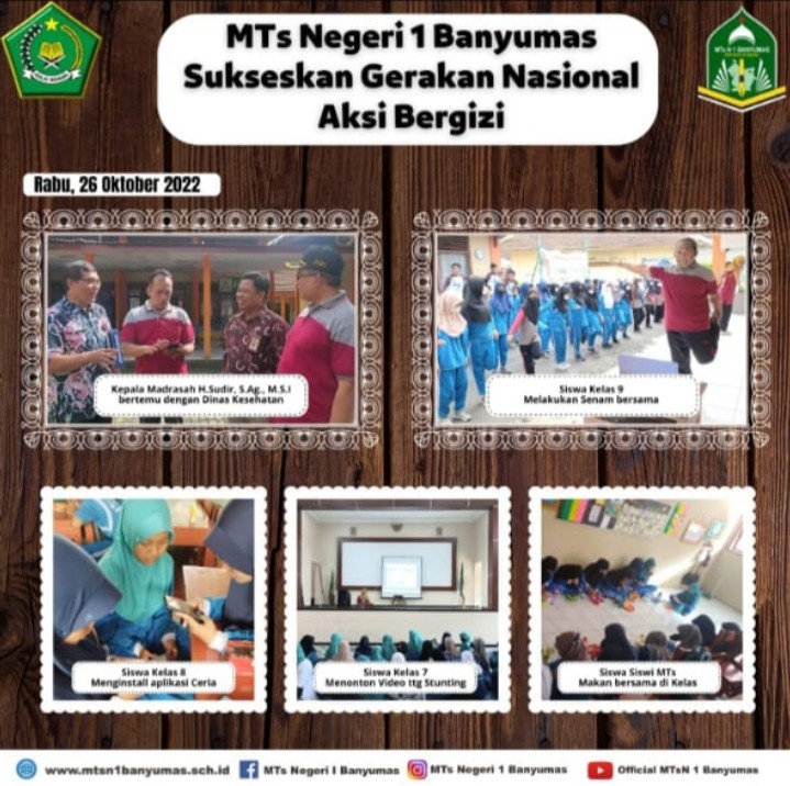 Kementerian Kesehatan bekerja sama dengan Kementerian Agama menggelar Gerakan Aksi Bergizi dalam rangka menekan kasus stunting di Indonesia, dilansir dari (antara) target gerakan ini menyasar 1.028 sekolah, termasuk MTs Negeri 1 Banyumas hari ini ikut mensukseskan kegiatan Gerakan Nasional Aksi Bergizi, Rabu, 26 Oktober 2022.