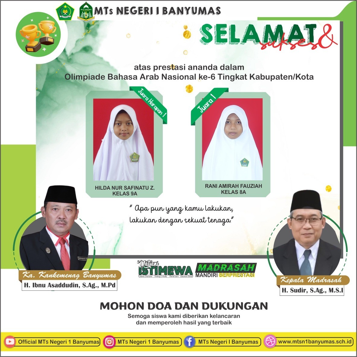 "Alhamdulillah pada tahun 2023 ini MTsN 1 Banyumas berhasil meraih prestasi kembali pada ajang OBA ke-6 sebagai Juara 1 dan Harapan 1", terus giat belajar dan semangat untuk melaju menuju tingkat propinsi", ujar Sudir selaku kepala MTsN 1 Banyumas.