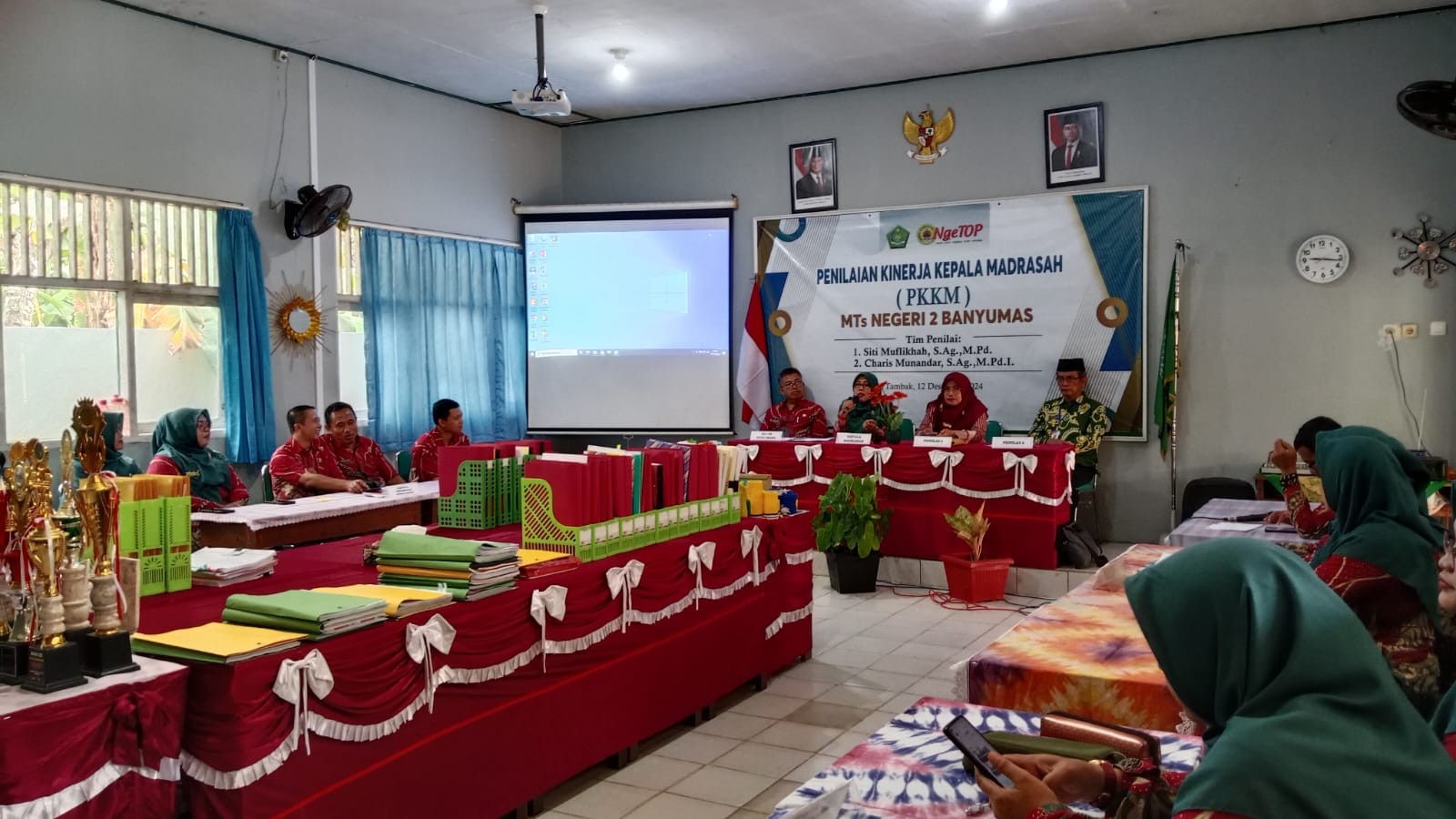 Banyumas (Humas) - Bertempat di ruang rapat MTsN 2 Banyumas, Penilaian Kinerja Kepala Madrasah Tahun 2024 berlangsung lancar dan teratur. Kegiatan ini dilaksanakan pada Kamis, 12 Desember 2024, mulai pukul 08.00-12.30 WIB. PKKM Tahunan ini menilai empat komponen pengembangan madrasah yaitu komponen Usaha Pengembangan Madrasah, Komponen Pelaksanaan Tugas Managerial Madrasah, Komponen Kewirausahaan, dan Komponen Supervisi. Kamis, (12/12).