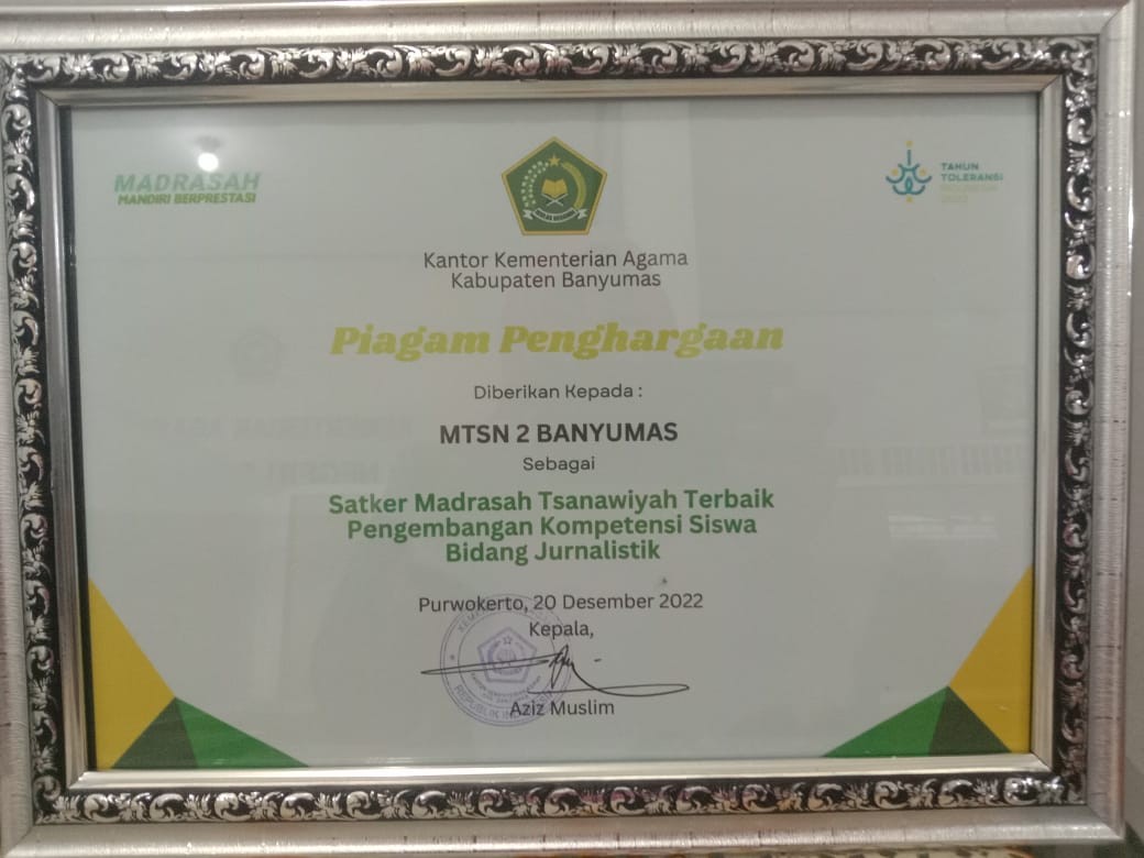 Banyumas : MTsN 2 Banyumas meraih piagam penghargaan Satuan Kerja MTs Terbaik Pengembangan Kompetensi Siswa Bidang Jurnalistik.