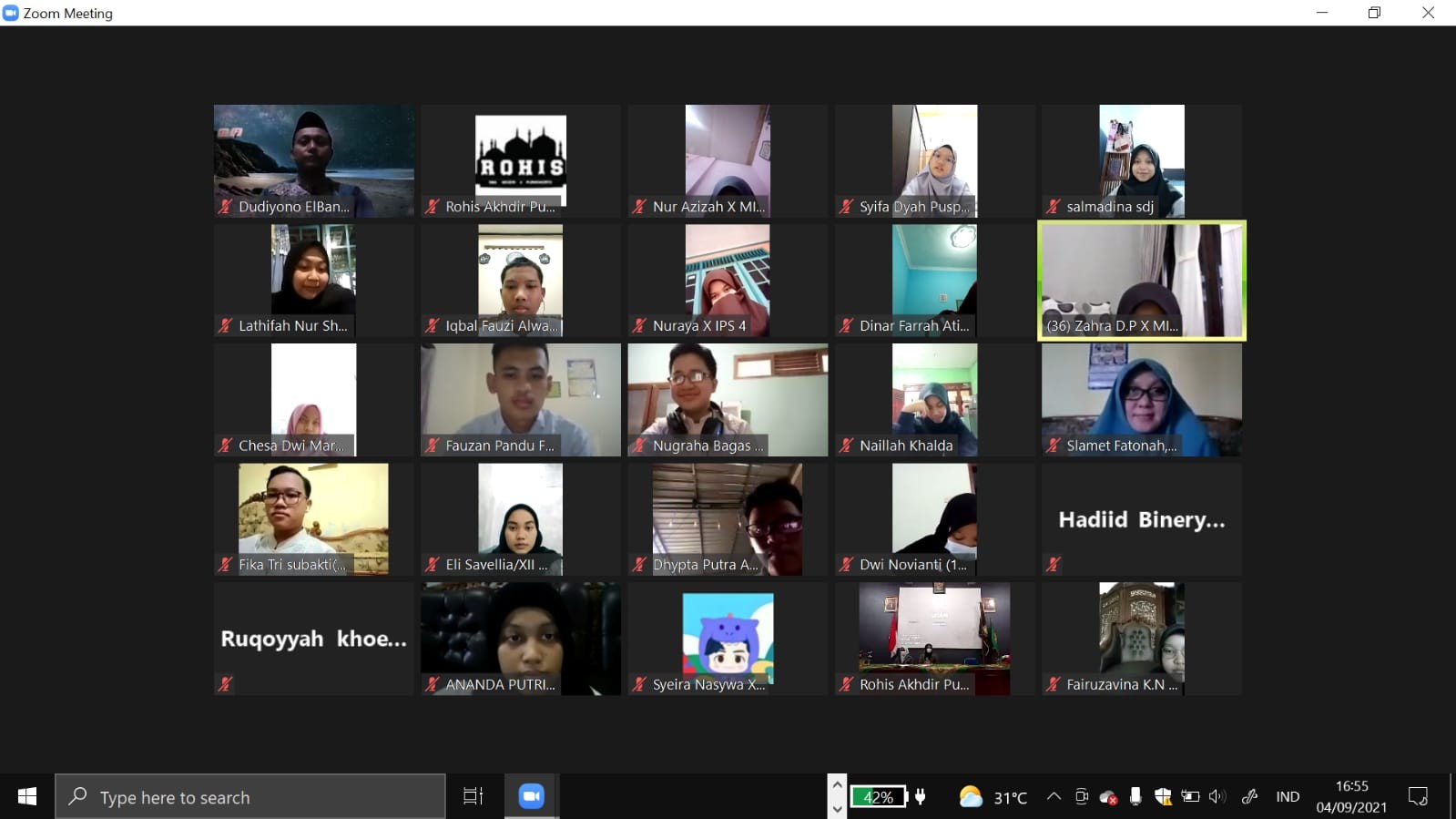 Purwokerto: OSIS dan Rohis Ahkdir SMAN 4 Purwokerto menggelar kegiatan kajian dan Istighotsah (Doa Bersama) secara virtual dalam rangka memperingati HUT SMA Negeri 4 Purwokerto ke 32 dan persiapan Pembelajaran Tatap Muka (PTM) yang mulai dilaksanakan Senin 6 September 2021. Kegiatan Kajian dan Istighotsah ini diikuti oleh seluruh siswa-siswi kelas 10, 11, dan 12 dengan menggunakan media Zoom Meeting dan Google Form (Sabtu, 4/9).