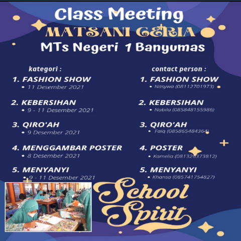 Kegiatan Class Meeting diharapkan mampu menjadi sarana bagi siswa untuk berkompetisi agar menjadi yang terbaik dalam berbagai bidang perlombaan, sekaligus sebagai pengisi waktu kekosongan sebelum nantinya masuk kegiatan pembelajaran di semester yang baru. Kegiatan ini juga diharapkan bisa menjadi motivasi bagi para siswa untuk belajar serta mengembangkan bakat di berbagai cabang lomba diantaranya Fashion Show, K7 (Ketertiban, Kebersihan, Keamanan, Kekeluargaan, Kerindangan, Keindahan dan Kerapihan) lingkungan Kelas, Qiro'ah, Menggambar Poster dan Menyanyi.