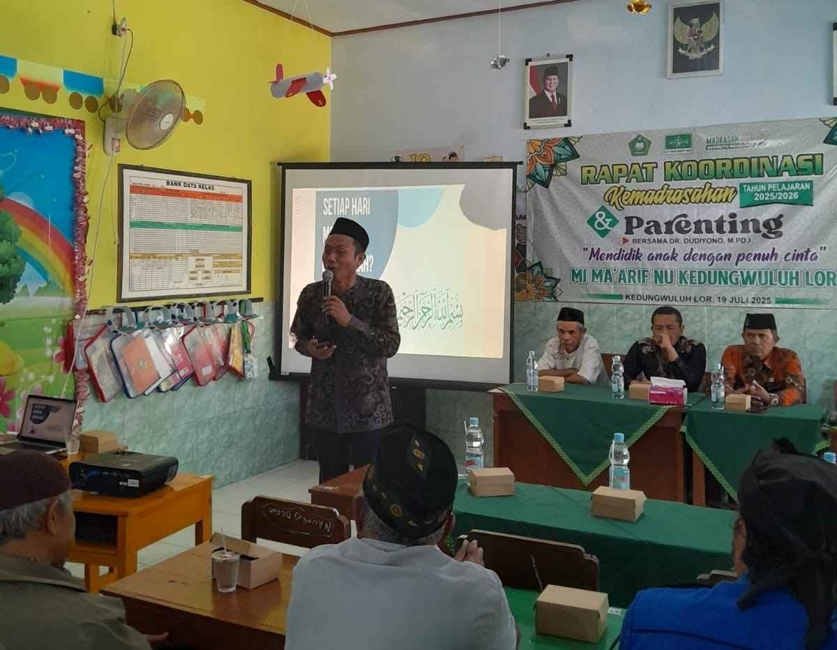 Banyumas – MI Ma’arif NU Kedungwuluh Lor menyelenggarakan kegiatan Parenting dan Rapat Koordinasi Kemadrasahan Tahun Pelajaran 2025/2026 yang diikuti oleh wali murid, dewan guru, Pengawas Pendidikan Kecamatan Patikraja, BP3MNU, dan Komiten MI Ma’arif NU Kedungwuluh Lor. Kegiatan ini berlangsung di gedung madrasah dengan suasana yang kondusif dan penuh antusiasme. Sabtu (19/07)
