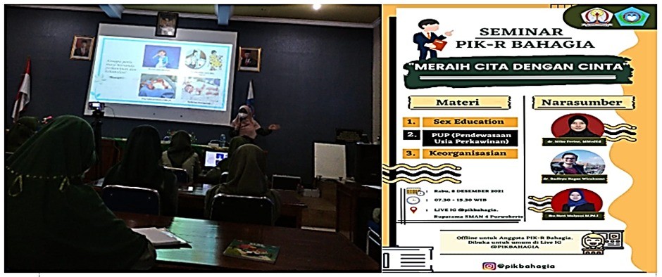 Anteng Saraswati, selaku Pembina PIK-R Bahagia menyampaikan, “Kegiatan ini penting dilaksanakan dengan sasaran generasi muda milenial. Dalam kegiatan ini kami memberikan materi tentang pembelajaran sex bagi remaja kaitannya dengan ilmu kedokteran. Kami memberikan pengenalan, kesadaran dan motivasi akan bahaya pergaulan bebas bagi remaja sehingga mereka dapat meraih cita-cita di masa depan, dan materi Pendewasan Usia Perkawinan (PUP) diantaranya menunda perkawinan sampai batas usia minimal untuk siap berkeluarga, mengusahakan agar kehamilan pertama terjadi pada usia yang cukup dewasa, menunda kehamilan anak pertama apabila telah terjadi perkawinan dini, sampai di usia 21 tahun. Kami memberikan materi dari kalangan yang profesional dibidangnya, agar peserta memahami betul dirinya dengan kesiapan masa depan ke jenjang perikahan”, jelasnya.