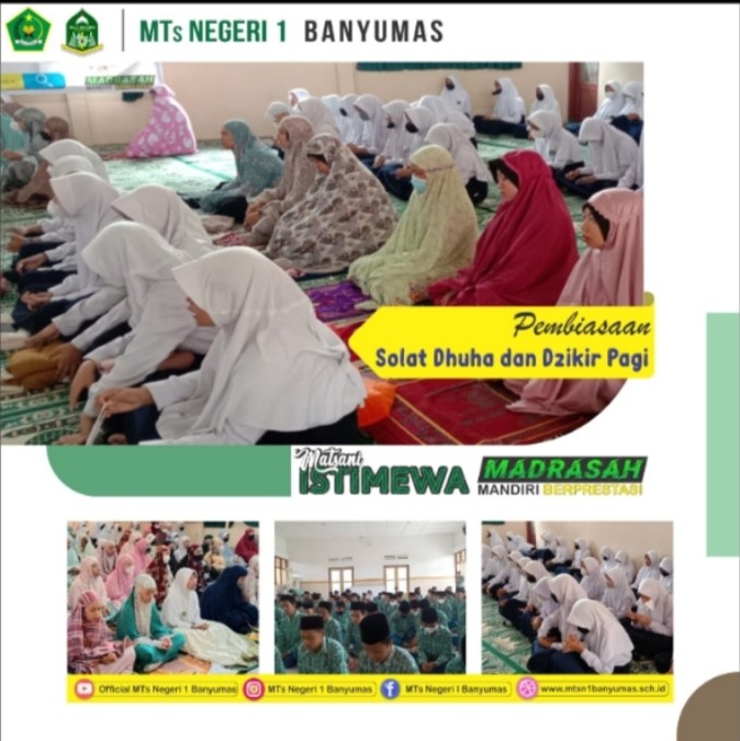 Pembiasan pagi yang dilaksankan di MTs Negeri 1 Banyumas terus di istikomahkan sampai hari ini dan akan diteruskan kedepannya, mengingat pentingnya kegiatan ini bagi pembentukan karakter Islami peserta didik, hari ini Kamis, 17 November 2022 pembiasaan pagi terjadwal untuk kelas 8 melaksankan sholat duha dan asmaul husna bertempat di masjid Manbaul Ulum untuk siswa putra dan bertempat di Aula untuk anak putri.