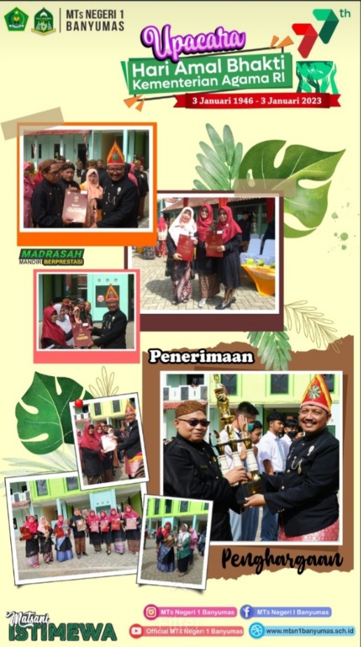 Upacara Hari Amal Bhakti Kementerian Agama Ke-77 tahun 2023 menambah keberkahan bagi MTsN 1 Banyumas. Sejumlah ASN menerima penghargaan Satya Lencana Karya Satya. Penyerahan penghargaan dilaksanakan bertepatan dengan Upacara HAB Kemenag yang di gelar oleh Kantor Kementerian Agama Kabupaten Banyumas bertempat di MAN 3 Banyumas yang berada di Sumpiuh pada hari Selasa, 3 Januari 2023.