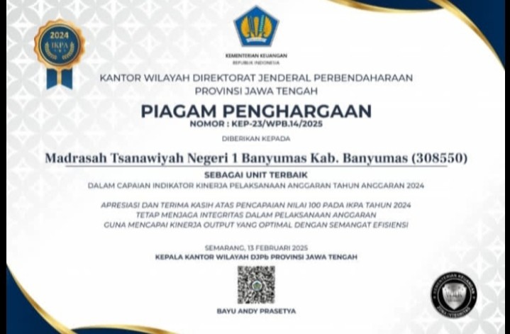 Purwokerto - MTs Negeri 1 Banyumas mendapatkan prestasi gemilang dalam rangka pencapaian indikator kinerja pelaksanaan anggaran tahun 2024. Melalui zoom meeting MTsN 1 Banyumas diberi penghargaan sebagai unit terbaik dalam pencapaian indikator kinerja pelaksanaan anggaran 2024 oleh Kepala Kanwil Ditjen Perbendaharaan Provinsi Jawa Tengah (20/02/2025).