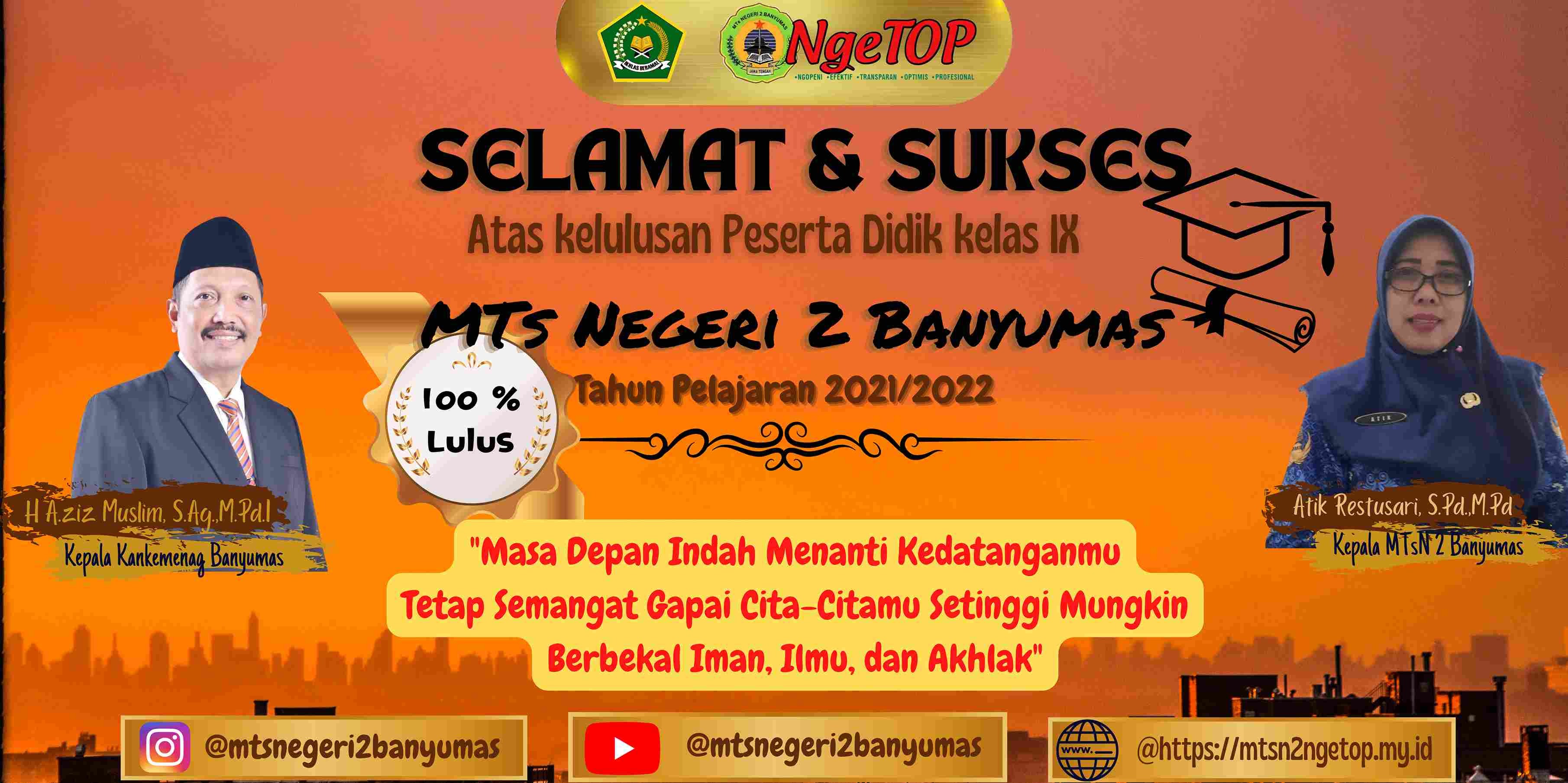 Berdasarkan Keputusan Dirjen Pendis No.455 Tahun 2022 tanggal 24 Januari 2022 tentang POS Penyelenggaraan Ujian Madrasah Tahun Pelajaran 2021/2022, serta Berdasarkan Hasil Rapat Dewan Guru MTs Negeri 2 Banyumas tentang Penentuan Kelulusan Pesdik Kelas IX MTsN 2 Banyumas Tahun Pelajaran 2021/2022 pengumuman kelulusan dilaksanakan secara daring pada Rabu (15/06) mulai pukul 17.00 WIB.