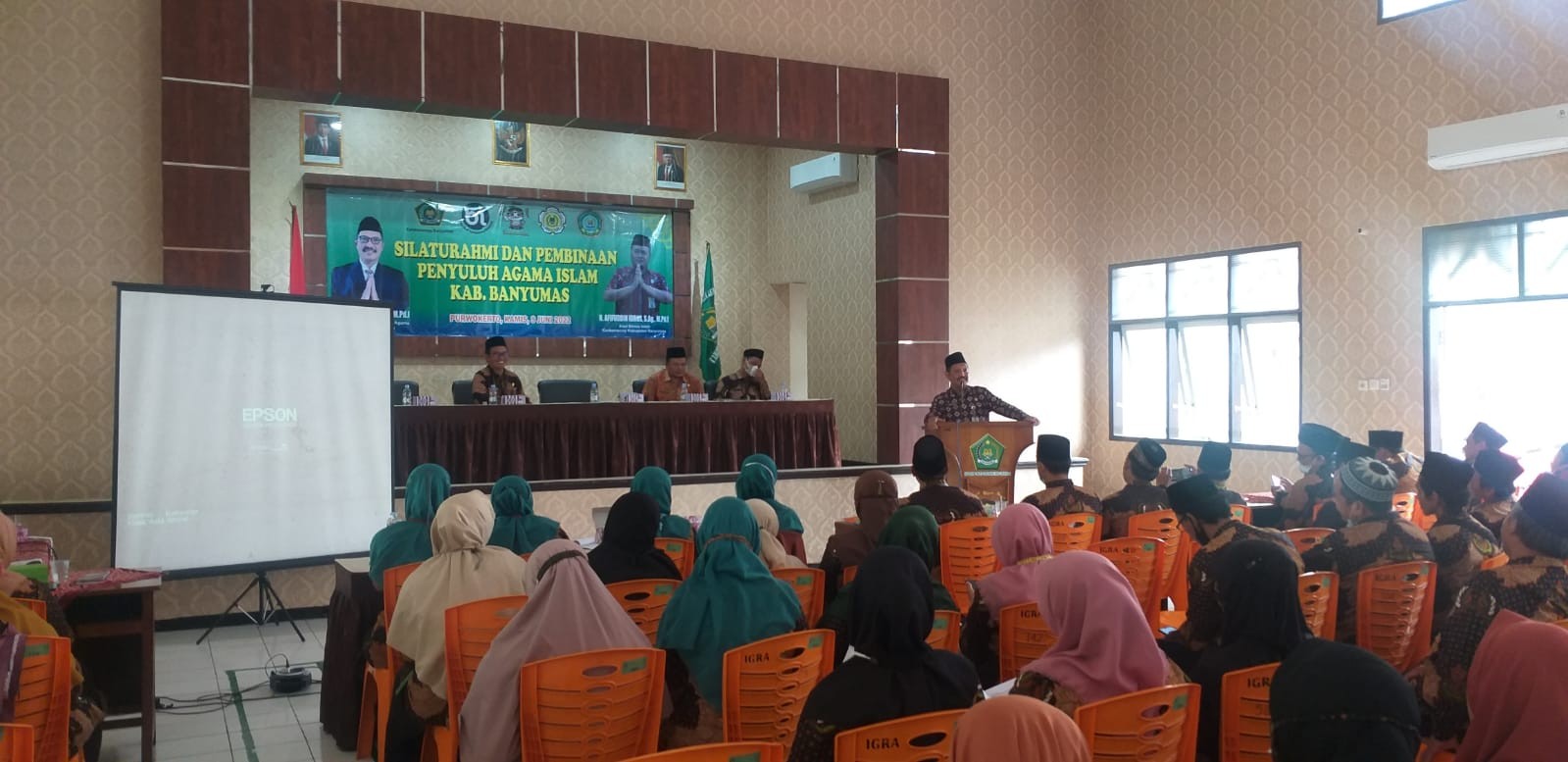 Purwokerto : “ Gus Menteri telah mencanangkan 7 program prioritas Kementerian Agama ,dan penyuluh adalah aktor terdepan sebagai corong dalam menyampaikan tujuh program Kementerian Agama. Salah satunya adalah program penguatan Moderasi Beragama.” Jelas Kepala Kantor Kemenag Kabupaten Banyumas H. Aziz Muslim,M.Pd.I saat memberikan arahan dan sambutan didepan 216 Penyuluh Agama Islam dalam acara Silaturahmi Dan Pembinaan Penyuluh Agama Islam Kabupaten Banyumas Tahun 2022 bertempat di Aula Al Ikhlas Kantor Kemenag Kabupaten Banyumas, Kamis (09/06).