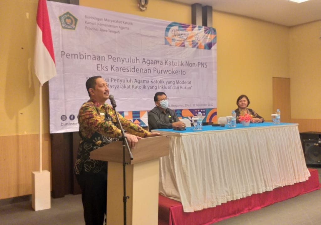 Purwokerto- Kepala Kantor Kemenag Kab. Banyumas membuka acara pembinaan dan penguatan moderasi beragama bagi dua puluh penyuluh agama Katolik Non PNS Se eks Karsidenan Banyumas. Kegiatan yang diadakan selama dua hari dari tanggal 29 – 30 September digelar di di Hotel Wisata Niaga Purwokerto , Kamis (29/09)