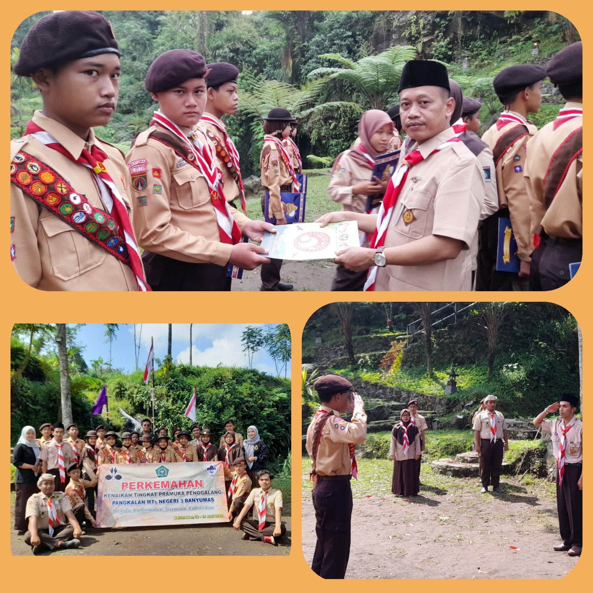 Banyumas – Pangkalan MTs Negeri 3 Banyumas menggelar Perkemahan Kenikan Tingkat Pramuka Penggalang dengan tema “Satyaku Kudarmakan, Darmaku Kubaktikan”. Kegiatan berlangsung selama dua hari yaitu pada tanggal 18 -19 Juni 2022 dengan tempat kegiatan di Guarau desa Karangsalam Kecamatan Baturaden. Diikui oleh 18 andik yang terdiri dari 13 putra dan 5 putri.