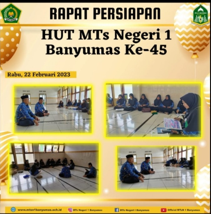 Sebentar lagi MTs Negeri 1 Banyumas akan merayakan Hari Ulang Tahun (HUT) ke-45, berbagai persiapan sudah mulai dilaksanakan dengan pembentukan panitia kegiatan, rapat-rapat pembahasan gambaran umum dan teknis kegiatan sebagaimana yang dibahas pada rapat hari ini, Rabu, 22 Februari 2023 bertempat di masjid Manbaul Ulum, yang dihadiri oleh Kepala Madrasah dan panitia kegiatan.