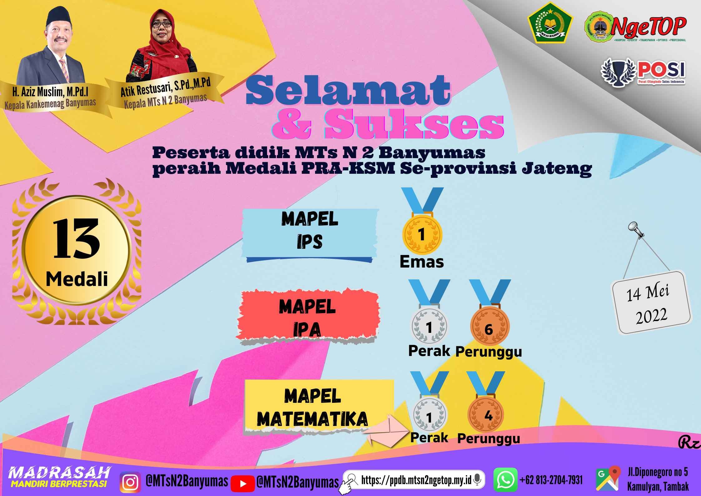 Banyumas- Setelah mengikuti kegiatan Pra KSM se Kanwil Jawa Tengah yang diselenggarakan pada Sabtu (14/5) melalui media online yang diselenggarakan oleh POSI (Pelatihan Olimpiade Sains Indonesia) bekerja sama dengan Kantor Wilayah Kementerian Agama Provinsi Jawa Tengah. Pesdik MTsN 2 Banyumas memperoleh hasil yang sangat memuaskan, terbukti dengan diperolehnya berbagai medali dari tiga mapel yang dilombakan yaitu matematika, IPA dan IPS terintegrasi.