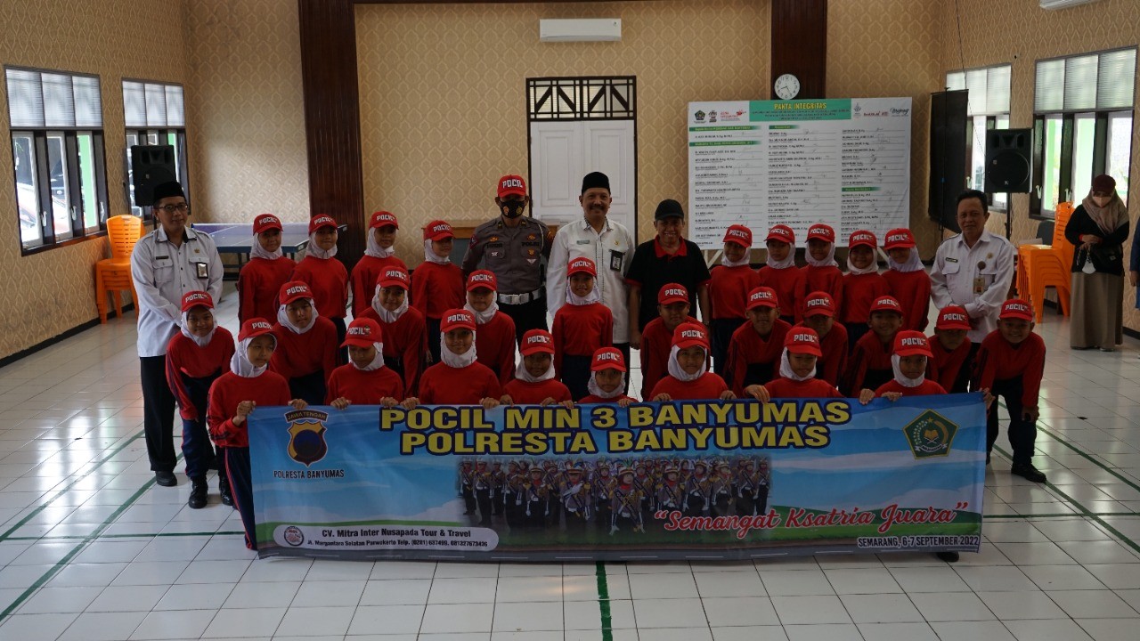Purwokerto : “ Kalian harus optimis untuk mengikuti lomba Polcil ditingkat Polda Jateng , harus bermental juara dan harus bangga karena bisa mewakili Karsidenan Banyumas”. Hal tersebut disampaikan oleh Kepala Kantor Kementerian Agama Kabupaten Banyumas H. Aziz Muslim, S.Ag, M.Pd.I saat melepas kontingen Polisi Cilik (POLCIL) dari MIN 3 Banyumas yang berhasil maju ke tingkat Polda Jateng mewakili Eks.Karsidenan Banyumas , Selasa (06/09)