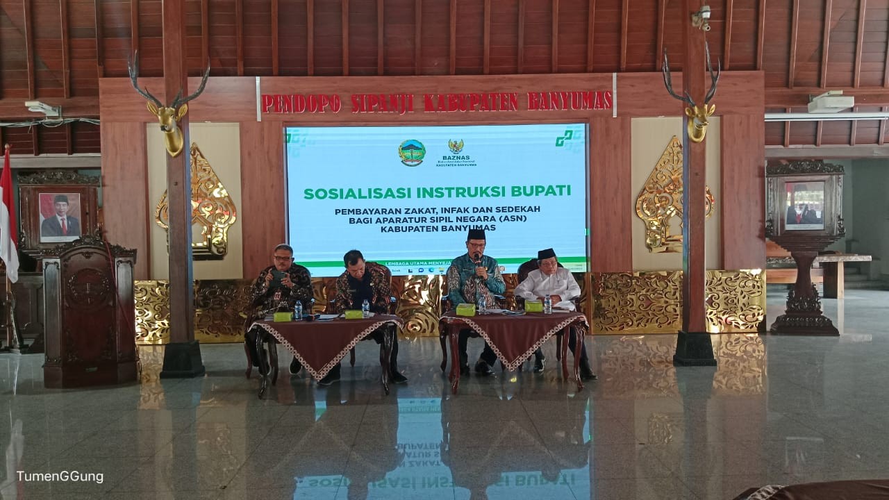 Purwokerto : Kakan Kemenag H. Aziz Muslim, bersama dengan Ketua MUI Banyumas KH. Taefur Arofat, Staff Ahli Bidang Hukum Setda Kabupaten Banyumas Sugeng Amin, Ketua BAZNAS menghadiri dan memberikan paparan dalam acara sosialisasi Instruksi Bupati No. 451.12/345/2023 terkait tentang pembayaran zakat, infak, dan sedekah bagi ASN kabupaten Banyumas di pendopo Sipanji. Rabu (15/02)