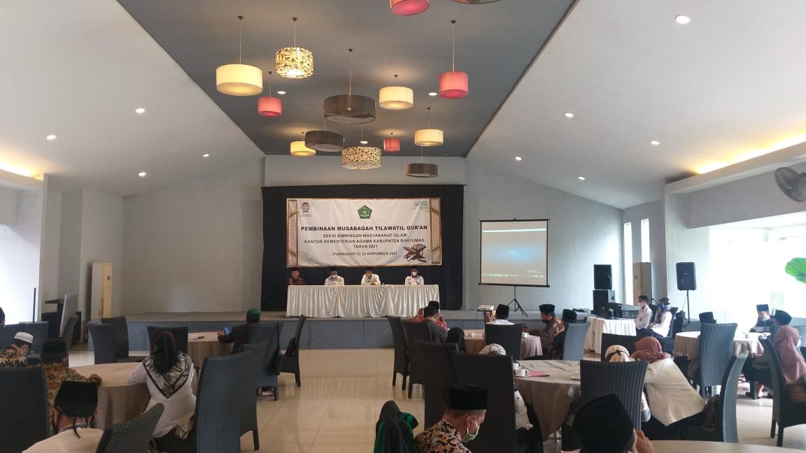 Purwokerto : Kakan Kemenag Banyumas Drs. H. Akhasin Aedi, M.Ag didampingi Ust. Ali Mas'Ud selaku narasumber , Usman Penyuluh Agam Islam , membuka acara Pembinaan Musabaqah Tilawatil Quran yang diadakan oleh Seksi Bimas Islam kantor Kemenag Kabupaten Banyumas tahun 2021. Diikuti oleh 38 pembina dan peserta MTQ se kabupaten Banyumas bertempat di Oemah Daun Resto , Selasa (23/11)