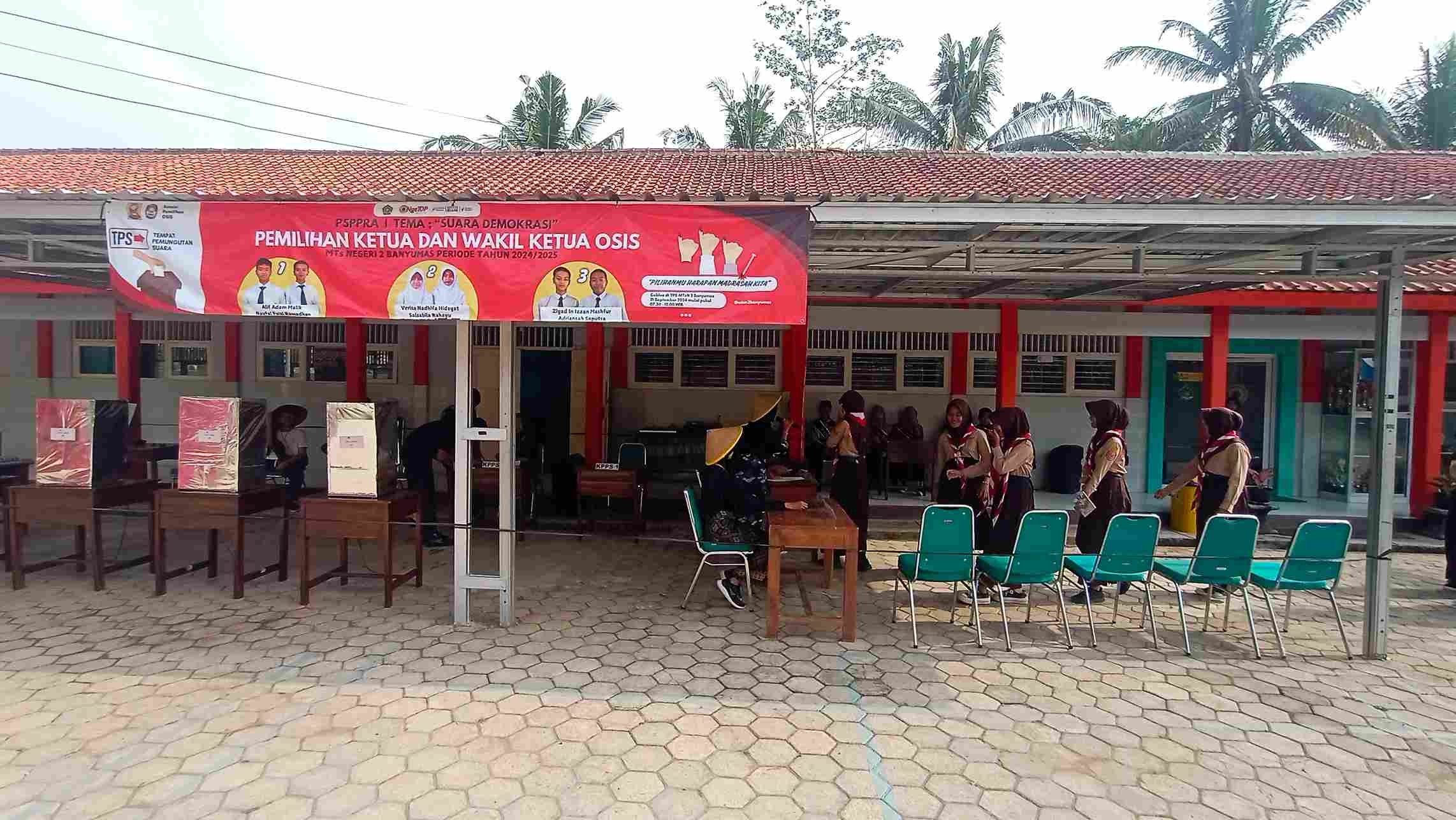 Banyumas (Humas) : Ketua dan wakil ketua Organisasi Siswa Intra Sekolah ( OSIS) di MTsN 2 Banyumas menjadi ajang peserta didik untuk belajar berdemokrasi. Proses pemilihannya pun digelar layaknya pemilu. Beberapa atribut pendukung pemilu seperti daftar hadir, bilik suara, kotak suara, papan penghitungan, surat suara, petugas pemilu, dan tinta lengkap teresedia. Kegiatan pemilihan ini berlangsung pada saat jadwal kegiatan pembelajaran P5PPRA yaitu pukul 08.30-12.00 di halaman depan MTsN 2 Banyumas, Sabtu, (21/9).
