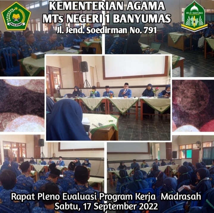 Evaluasi kegiatan merupakan bagian yang penting untuk mewujudkan cita-cita madrasah, untuk itu penyelenggaraannya sangat perlu dilakukan agar program-program yang selama ini dilaksanakan bisa terpantau dengan baik apakah sudah terlaksana secara maksimal atau belum. Pada hari ini, Sabtu, 17 September 2022 MTs Negeri 1 Banyumas menyelenggarakan rapat pleno evaluasi program kerja madrasah yang dihadiri oleh seluruh dewan guru dan karyawan MTs Negeri 1 Banyumas yang bertempat di ruang aula.