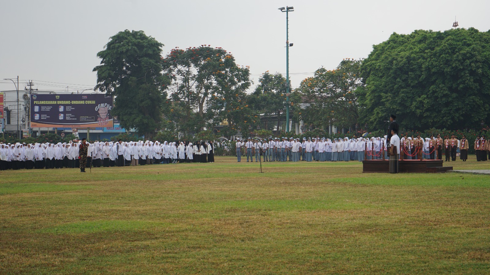 Purwokerto (Humas) - Kantor Kementerian Agama Kabupaten Banyumas bekerjasama dengan Pemerintah Kabupaten Banyumas menggelar upacara memperingati Hari Santri Nasional 2023. Upacara yang dilaksanakan di alun-alun kota Purwokerto ini dihadiri oleh Forkompinda, jajaran pejabat Kankemenag Banyumas, TNI, Polri, Ketua Bawaslu, Komisariat KPU, LPP Al Irsyad, UIN Saizu Purwokerto, unsur ormas, ulama, tokoh masyarakat dan ratusan santri dari berbagai Pondok Pesantren di wilayah Kota Purwokerto. Minggu (22/10)