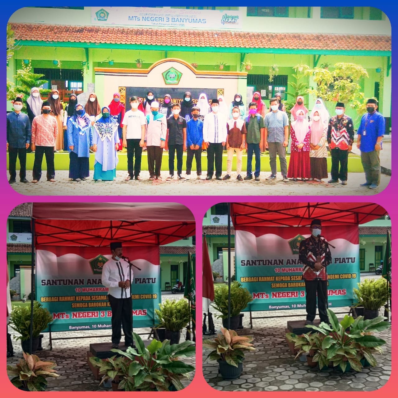 MTs Negeri 3 Banyumas (20/08). Dalam rangka menyambut tanggal 10 Muharam tahun 1442 H Sub UPZ MTs Negeri 3 Banyumas mengadakan santunan anak Yatim Piatu, kegiatan santunan anak yatim piatu tersebut bertempat di halaman utama MTsN 3 Banyumas pada Jum’at (20/08) tetap dengan protokol kesehatan karena masih dalam masa pandemi covid 19.