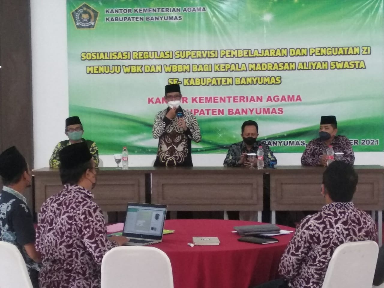 PURWOKERTO - Pembangunan Zona Integritas yang digalakkan Kantor Kementerian Agama Kabupaten Banyumas harus mengakar kuat di semua lini termasuk di Madrasah Aliyah Swasta di Kabupaten Banyumas. "MA Swasta perlu mendukung dan menguatkan Zona Integritas" tegas Kasi Pendidikan Madrasah, Edi Sungkowo saat Sosialisasi Regulasi Supervisi Pembelajaran dan Penguatan ZI bagi Kepala MA Swasta di D'Garden Resto, Jum'at (3/12) kemarin. "Jangan memberikan sesuatu apapun atas layanan yang kita berikan", ujar Edi.