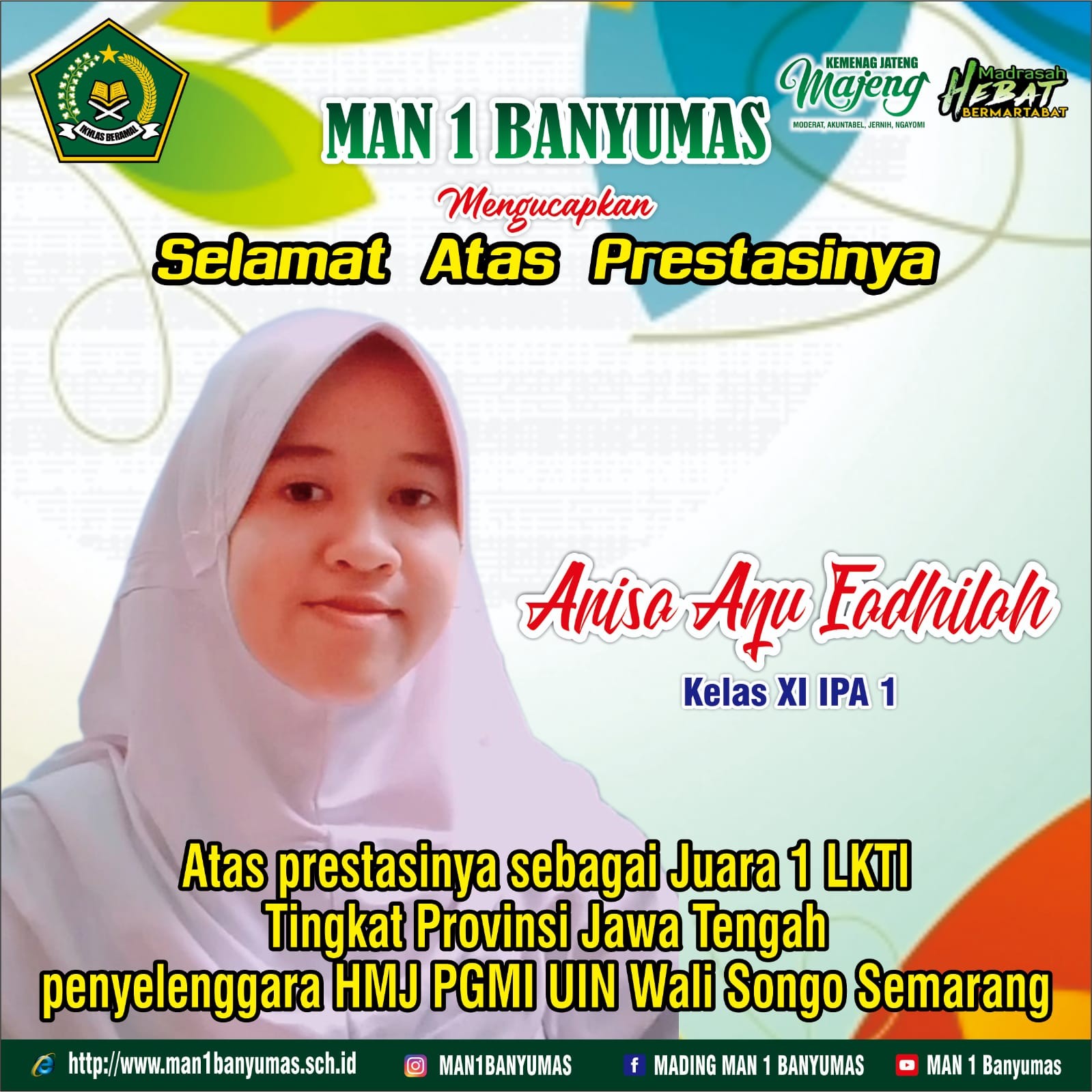 Mengawali tahun pelajaran baru 2021/2022, prestasi kembali ditorehkan oleh siswa Madrasah Aliyah Negeri (MAN) 1 Banyumas dalam Lomba Karya Tulis Ilmiah (LKTI) SMA/MA sederajat tingkat Propinsi Jawa Tengah yang keluar sebagai juara I. Kegiatan LKTI ini bertajuk “Kreativitas, inovasi dan Strategi Generasi Mileneial Sebagai Upaya Kualita Pendidikan Di Era Digital” dan diselenggarakan oleh UIN Wali Songo Semarang. dimulai dari tanggal 17Juni sampai 12 Juli dan diikuti oleh puluhan TIM LKTI SMA/MA se-Jawa Tengah.