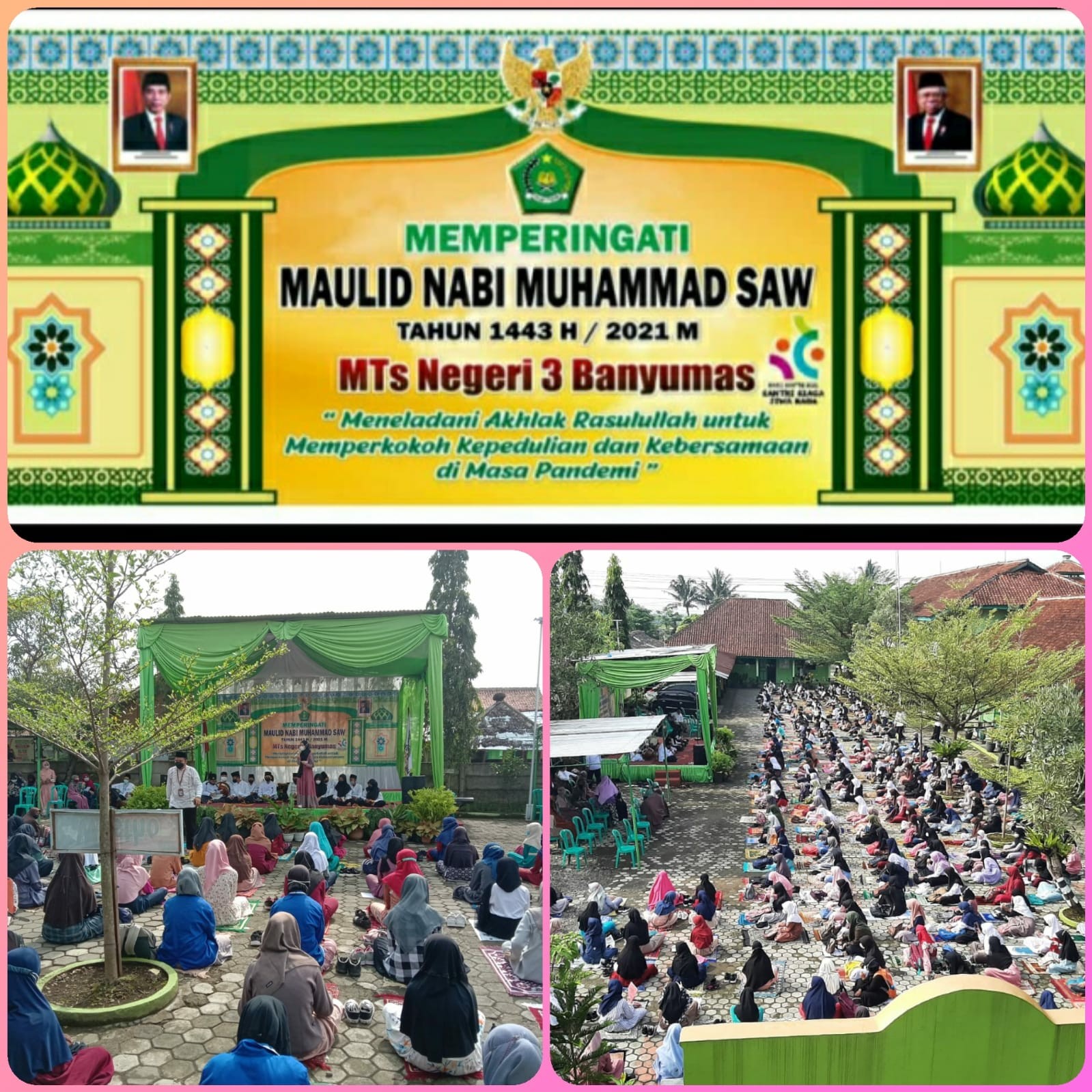 Banyumas, 19-10-2021. Siswa-siswi MTs Negeri 3 Banyumas diharapkan bisa meneladani Akhlak Rosulullah untuk Memperkokoh kepedulian dan kebersamaan dalam kehidupan sehari-hari terutama di masa pandemi ini. Demikian disampaikan Syarief Hidayat, S.Ag.Kepala MTsN 3 Banyumas dalam sambutan peringatan Maulid Nabi Muhamad, SAW. Selasa 10 Oktober 2021 di halaman MTs Negeri 3 Banyumas desa Silado, Kecamatan Sumbang, Kabupaten Banyumas. Diikuti oleh seluruh dewan guru dan tenaga kependidikan, dan siswa-siswi yang saat ini melaksanakan pembelajaran tatap muka terbatas sebesar 50 persen dari jumlah siswa madrasah, hal ini sudah sesuai dengan ijin gugus kovid Kabupaten Banyumas. Pelaksanaan tetap melaksanakan protokol kesehatan dengan tetap melaksanakan 5M dan 1 D. Walau dimasa pandemi namun kita harus tetap melakukan kegiatan yang positif, kreatif, inovatif, melambungkan eksistensi diri dan selalu berprestasi dalam segala hal baik dalam akademik maupun non akademik siap mewujudkan madrasah mandiri berprestasi. Peringatan maulid nabi yang diperingati setiap tanggal 12 Robiul Awal pada hakekatnya sebagai upaya mengingat kembali hari kelahiran dan sejarah hidup nabi, meningkatkan komitmen memegang teguh ajarannya dan menjadikan beliau sebagai figur teladan utama bagi kaum muslimin khususnya dan setiap manusia pada umumnya termasuk kita semua tambah pak Syarief.