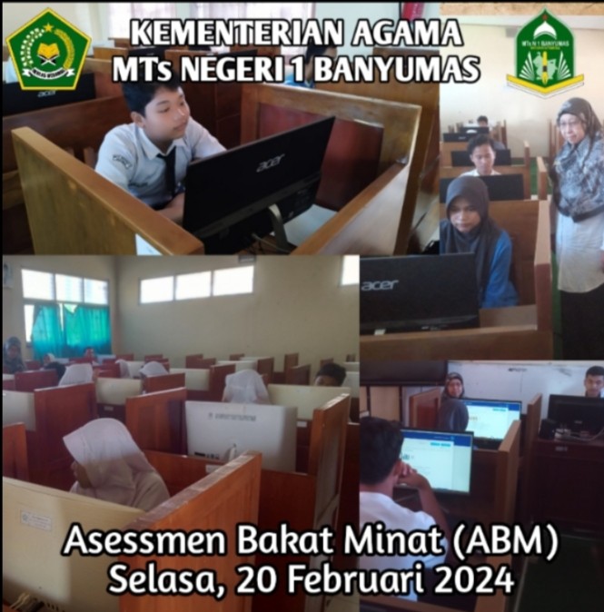 Assesmen Bakat Minat (ABM) merupakan assesmen yang digunakan untuk mengukur aspek kemampuan minat maupun bakat siswa, yang diukur pada ABM (Assesmen Bakat Minat) meliputi kemampuan verbal, kuantitatif, penalaran, spasial, mekanik, klerikal, dan penggunaan bahasa serta dilengkapi dengan tes minat. AMB di MTs Negeri 1 Banyumas digelar pada hari ini, Selasa, 20 Februari 2024 bertempat di Ruang CBT dengan peserta terdiri dari siswa kelas 9 peserta terbagi menjadi 3 ruangan.