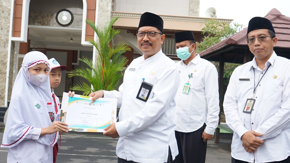 Piala dan piagam penghargaan tersebut diserahkan secara langsung oleh Kepala kantor Kementerian Agama Kabupaten Banyumas H. Aziz Muslim, S.Ag, M.Pd.I didampingi oleh Kasubag TU dan Kasi PAI pada saat apel Senin pagi dihalaman kantor. Senin (14/11)