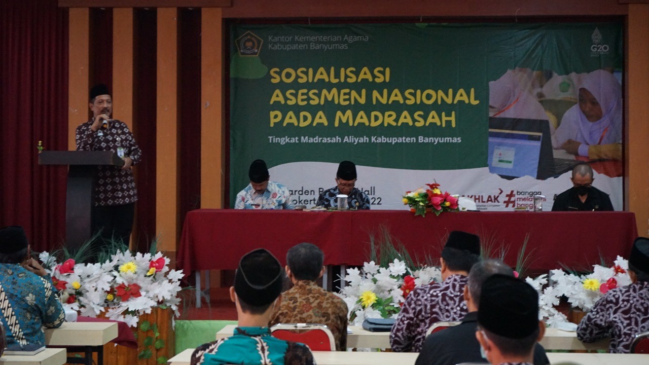 Purwokerkto : Setiap pengelola madrasah harus memiliki obsesi-obsesi agar madrasahnya menjadi yang terdepan,terinovatif serta mampu berkompetisi diera digital . Perlu perjuangan dan komitmen dari semua pihak dan yang terpenting adalah bagaimana para pengelola madrasah ini menyamakan frekwensinya,menyatukan derap langkahnya agar visi dan Missi madrasah tercapai,Jelas Kepala Kantor Kemenag Kabupaten Banyumas Aziz Muslim, S.Ag, M.Pd.I saat membuka dan memberikan sambutan dalam acara Sosialisasi Asesmen Nasional Pada Madrasah, di De Garden Resto Purwokerto, (09/06)