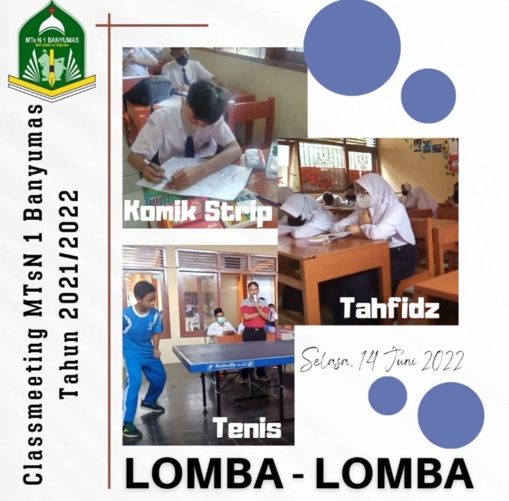 Mengisi kekosongan waktu setelah PAT sambil menunggu proses pembagian raport, OSIS MTs Negeri 1 Banyumas menyelenggarakan kegiatan Class Meeting yang di ikuti oleh seluruh perwakilan kelas 7 dan 8, mulai hari ini, Selasa, 14 Juni 2022 sampai dengan Sabtu, 18 Juni 2022.