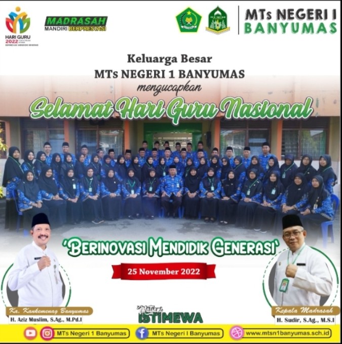 Hari guru yang diperingati setiap tanggal 25 November diperingati oleh seluruh anak Negeri, termasuk MTs Negeri 1 Banyumas. Hari ini, Jum'at 25 November 2022 MTs Negeri 1 Banyumas melaksankan upacara dalam rangka memperingati hari guru Nasional yang dilksanakan di halaman MTs Negeri 1 Banyumas dan diikuti oleh Bpk/Ibu Guru dan Karyawan serta siswa.