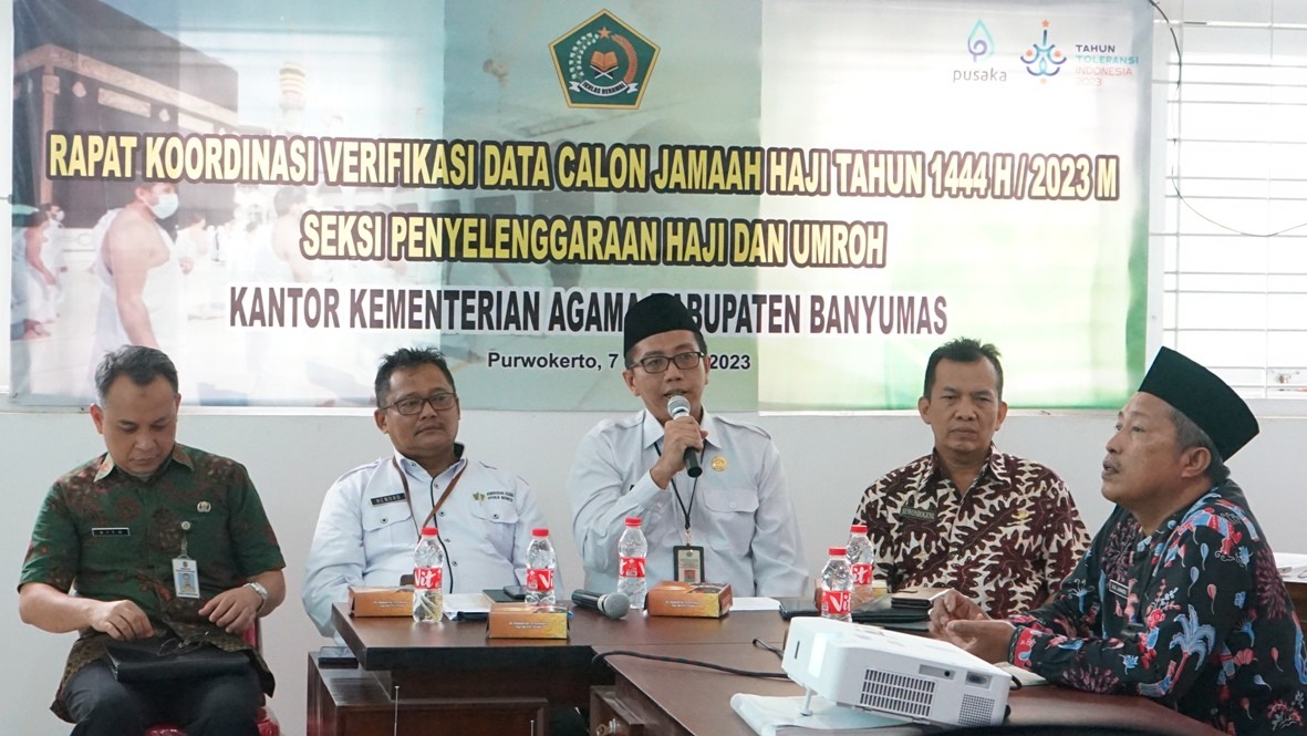 Oleh HUMASPurwokerto : Kasubag TU H. Muhammad Wahyu Fauzi Aziz mewakili Kepala Kantor Kemenag Banyumas membuka kegiatan Rapat Koordinasi Verifikasi Data Jamaah Haji tahun 2023 di ruang pertemuan Kantor Kemenag Banyumas. Selasa (07/02)