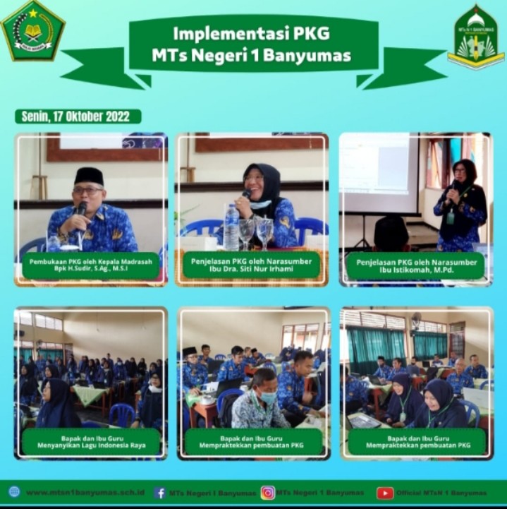 MTs Negeri 1 Banyumas menyelenggarakan workshop Implementasi Penilaian Kinerja Guru ( PKG) yang dilaksanakan pada hari Senin, 17 Oktober 2022 bertempat di aula MTs Negeri 1 Banyumas dan diikuti oleh seluruh Bpk/Ibu Guru dengan narasumber pertama Dra. Siti Nur Irhami dan sebagai narasumber kedua Istikomah, S.Pd., M.Pd.